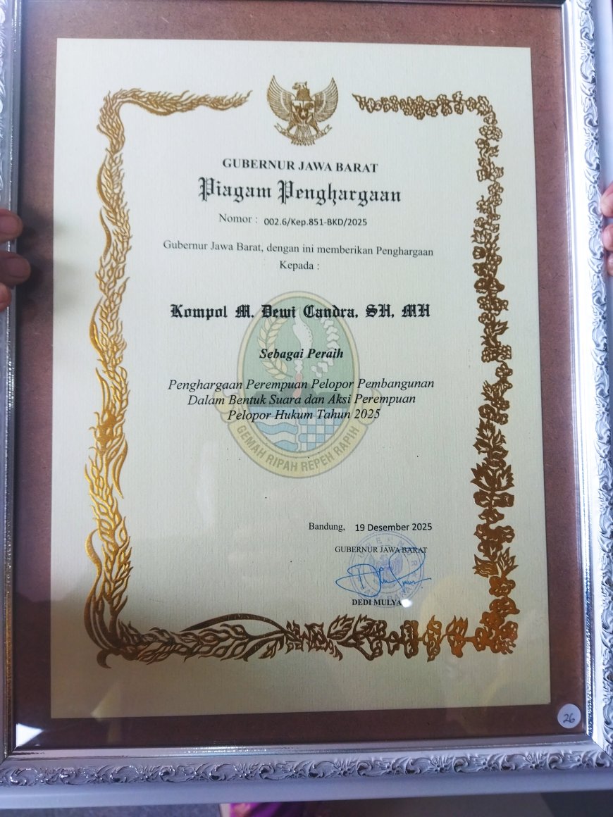 Bandung - Kanit 2 Subdit 4 Ditreskrimum Polda Jawa Barat, Kompol M. Dewi Candra, S.H., M.H., meraih Penghargaan Perempuan Pelopor Pembangunan dalam bentuk “Suara dan Aksi Perempuan Pelopor” (SIAP) Bidang Hukum Tahun 2025. Penghargaan tersebut tertuang dalam Keputusan Nomor 002.6/Kep.851-BKD/2025 yang ditandatangani oleh Gubernur Jawa Barat Dedi Mulyadi pada 19 Desember 2025.
